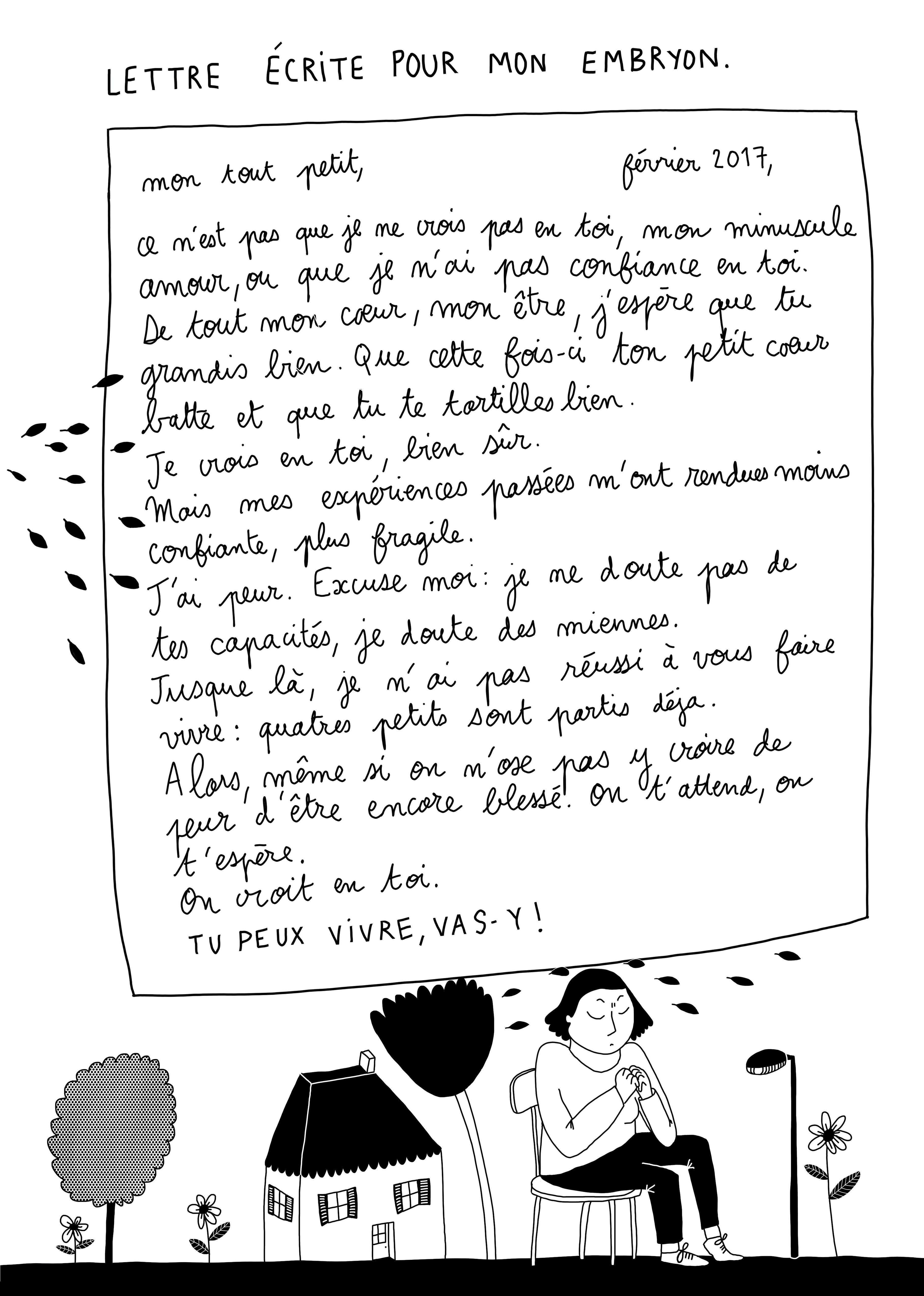 Ne pas trop espérer, au cas ou. Ma psy me conseille d’écrire à ce futur bébé, cet embryon, de lui laisser une place, une chance.